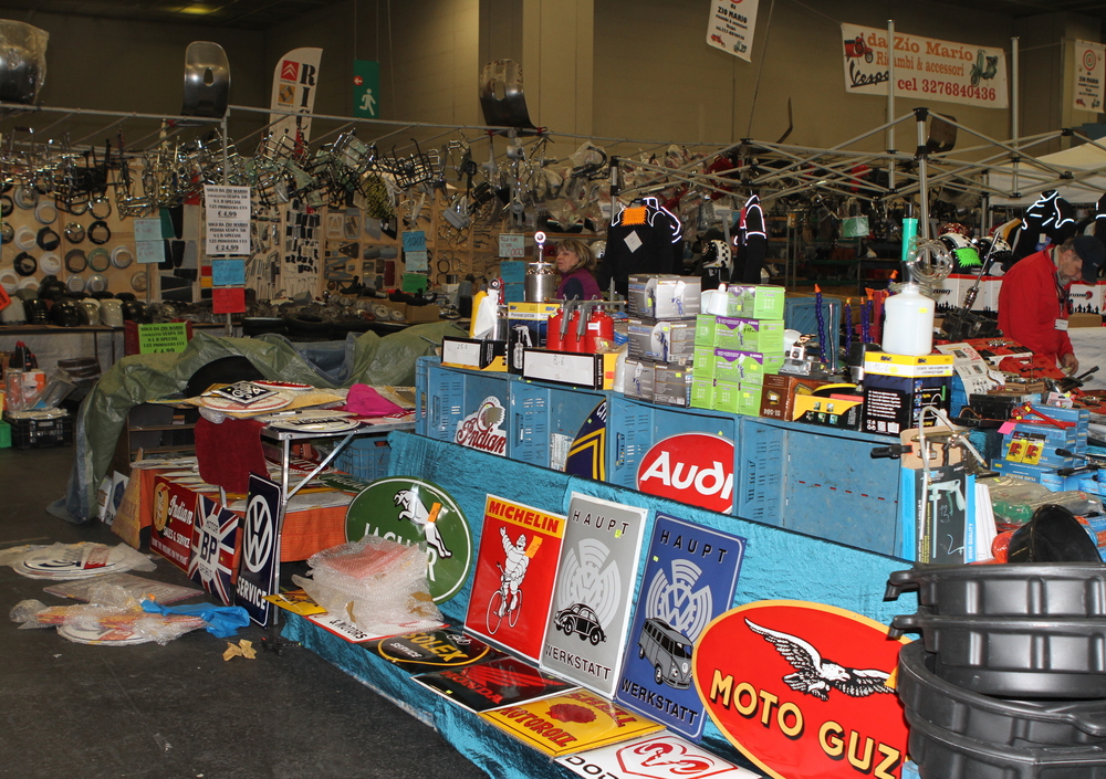 Un buon numero di stand espongono manualistica, libri utili al restauro o solamente da leggere o da sfogliare. Si possono trovare manifesti d'epoca, targhe e pubblicità vintage, mug con i modelli di vecchi moto, decals e rifiniture per scooter e moto. E poi fari, luci stop, rubinetti benzina, prodotti per ridare vita a metalli ossidati e vernici rovinate.