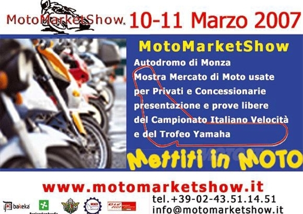 La 2a edizione del MotoMarketShow, che l’anno scorso ha riscosso degli ottimi risultati con più di 4300 visitatori e 50 espositori, avrà luogo nel mitico Autodromo Nazionale di Monza, nei giorni sabato 10 e domenica 11 marzo 2007, dalle ore 10.00 alle ore 20.00, in contemporanea con la presentazione ufficiale del CIV “Campionato Italiano Velocità” ed il trofeo Yamaha con la R6 CUP.