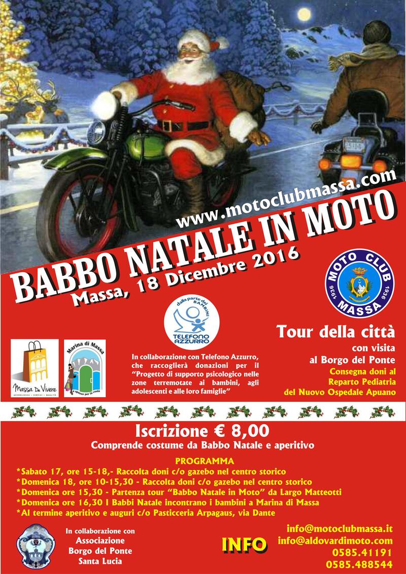 I Babbi Natale motociclist,i carichi di doni, percorreranno le storiche vie del centro della città versiliese domenica 18 dicembre, a partire dalle ore 15, attraversando Borgo del Ponte destinazione Carrara, Marina di Carrara e Marina di Massa, esibendosi per i bambini presenti. Proseguiranno poi il loro tour presso il Nuovo Ospedale Apuano, dove consegneranno i regali, che saranno raccolti sabato pomeriggio e domenica in piazza Aranci a Massa, ai bambini ricoverati nel reparto Pediatrico. L'iniziativa, in collaborazione con l'Associazione Borgo del Ponte e Aldovardi Moto, vede coinvolto anche Telefono Azzurro, che raccoglierà donazioni in favore di azioni di supporto psicologico a bambini e famiglie delle zone terremotate.