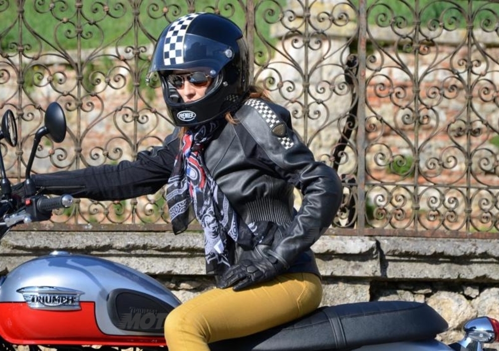La giacca è lunga oltre i fianchi e sugli stessi arricciata, è impreziosita sulle spalle da una fetuccia a scacchi che la rende sportiveggiante, è perfetta per una moto dallo stile classico e per una donna che vuole un capo stiloso per andare in moto in qualsiasi occasione.