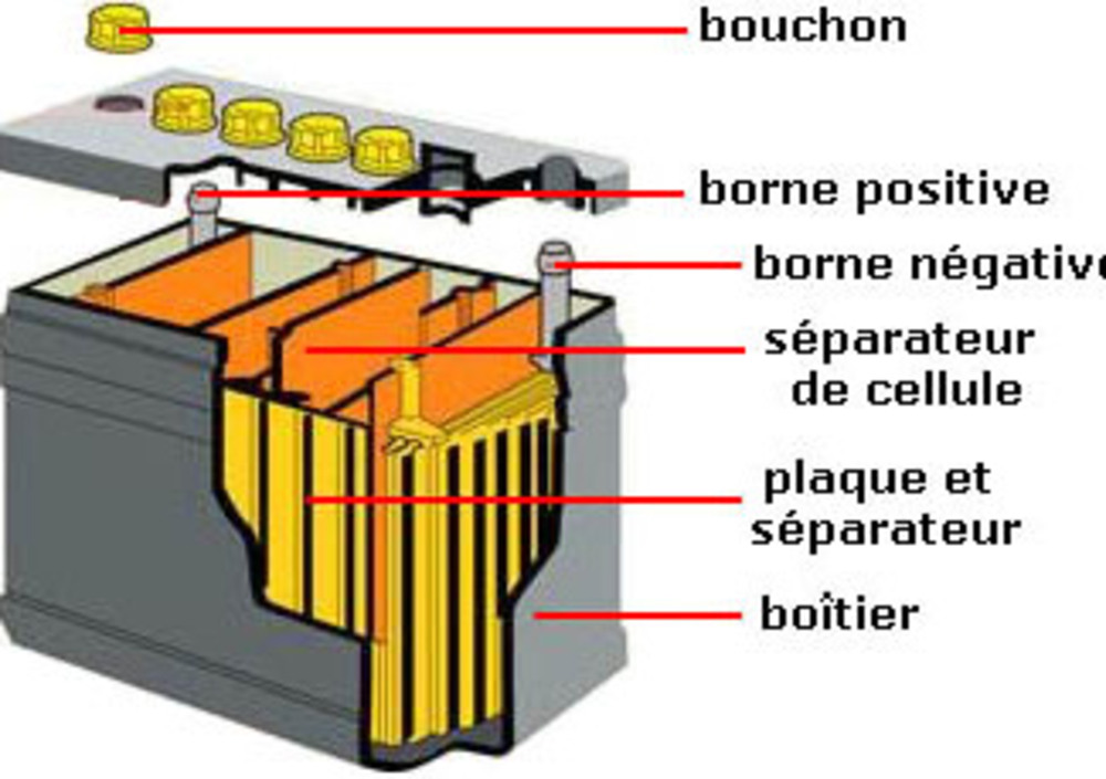L’energia elettrica viene immagazzinata e successivamente restituita, inviandola al circuito e quindi ai vari utilizzatori, grazie a reazioni chimiche che hanno luogo al suo interno, nei due sensi. Una tipica batteria è costituita da un involucro nel quale è alloggiata una serie di elementi contenenti liquido elettrolitico nel quale sono immerse le piastre (positive e negative), tra le quali sono collocati dei separatori.