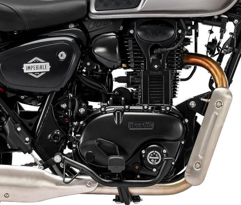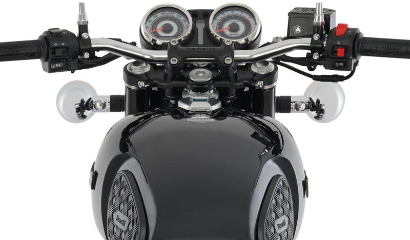 Cambiano le grafiche, sul serbatoio arrivano un logo Benelli tridimensionale color argento e nuovi paraginocchia in gomma e sono più belli in chiave vintage anche i loghi sulle fiancatine.