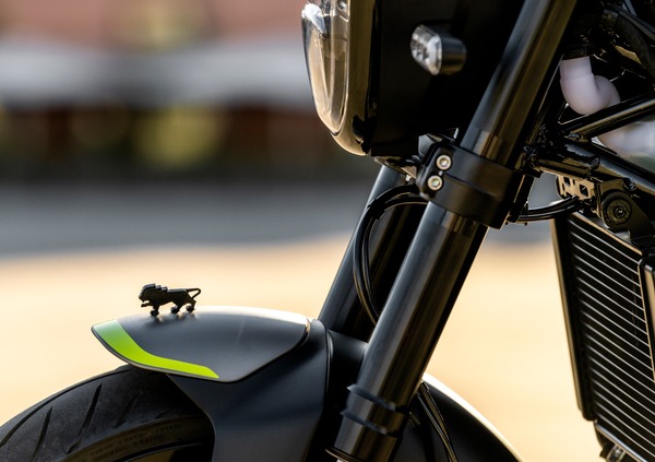 Il reparto sospensioni si affida a una forcella rovesciata con steli da 41 mm e di a un monoammortizzatore centrale ed escursione di 53 mm. L’impianto frenante vede un disco singolo flottante anteriore da 280, con pinza a quattro pistoncini, e il disco posteriore da 240 mm. I cerchi in lega di alluminio da 17 pollici calzano pneumatici da 110/70-R17 e 150/60-R17.