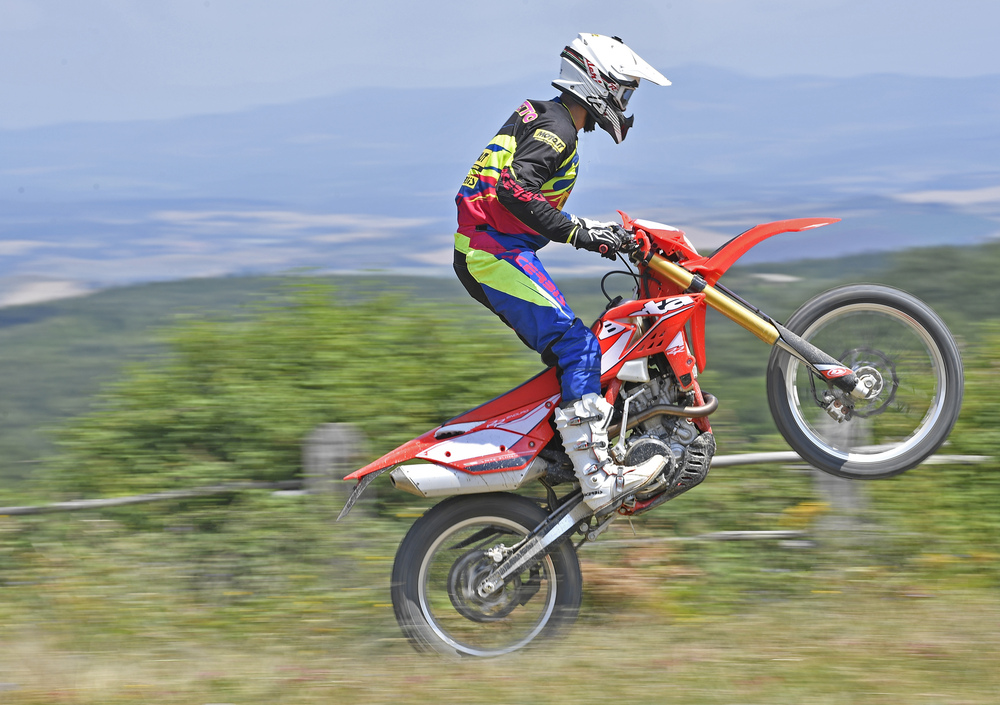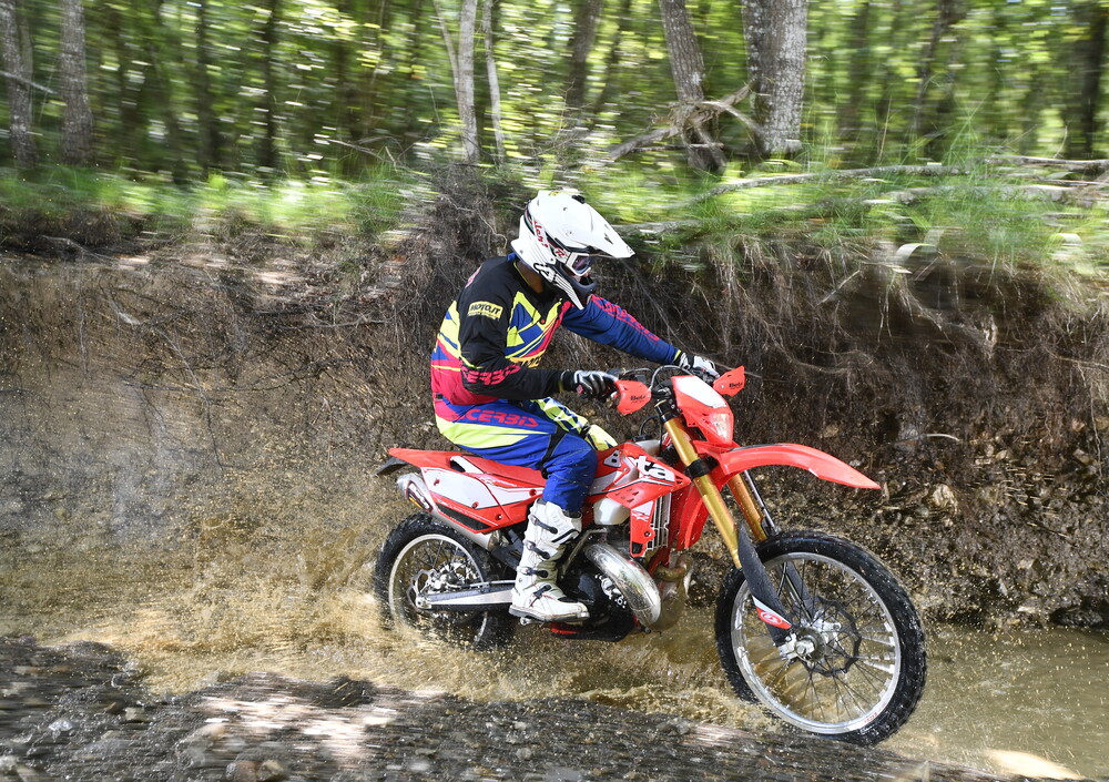 La Beta Enduro RR 250 2t si presenta come sempre molto piccola e leggera. Pesa 104 kg a secco e ha un capiente serbatoio da 9,5 litri. E' una moto dal guizzo immediato nello stretto, dove mostra un DNA quasi trialistico. Il motore è molto lineare e docile ai bassi regimi, dove si apprezza la carburazione perfetta, che non porta a fastidiosi riempimenti del carburatore nemmeno in discesa. L'allungo del motore è convincente, mentre con le marce lunghe manca la botta di coppia della sorellona di 300 cc. La nuova forcella Sachs da 48 m spicca per due caratteristiche: da un lato ha una scorrevolezza ottimale ed è molto rapida a partire; dall'altro vanta una taratura un pelo morbida nella guida più aggressiva (tipica ad esempio dei test in fettucciato). Durante la nostra prova abbiamo preferito non intervenire sull'idraulica, perché questa taratura improntata alla scorrevolezza si è rivelata perfetta per affrontare in sicurezza i tratti hard, disseminati di radici e massi.