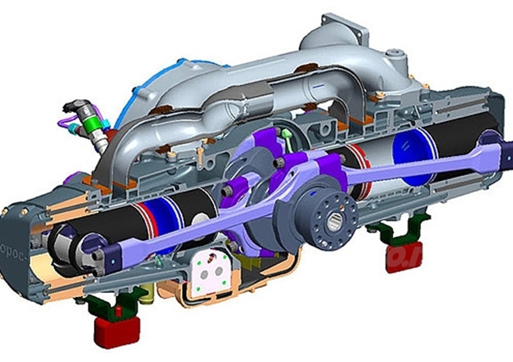 L’acronimo “OPOC” sta per “Opposed Pistons and Opposed Cilinder”, e si riferisce ad uno schema tecnico decisamente inusuale, seppur non inedito, e realizzabile solamente con distribuzione a 2 tempi. Come si evince dal disegno CAD, in pratica si tratta di un motore bicilindrico boxer con quattro pistoni. In ogni cilindro scorrono quindi due pistoni contrapposti: i due più interni (i più vicini all’albero motore) vengono tradizionalmente spinti verso l’esterno da normali bielle coassiali molto corte, mentre altre due lunghe bielle spingono gli altri due pistoni – collegati ad esse tramite un imbiellaggio esterno – in senso opposto, verso gli altri due. In pratica, le camere di scoppio sono costituite dalle intercapedini che rimangono tra i cieli delle coppie di pistoni contrapposti quando essi si trovano “faccia a faccia” ai rispettivi P.M.I. (punti morti superiori). Non solo: questo rivoluzionario propulsore è pure dotato di turbocompressore gestito elettronicamente!