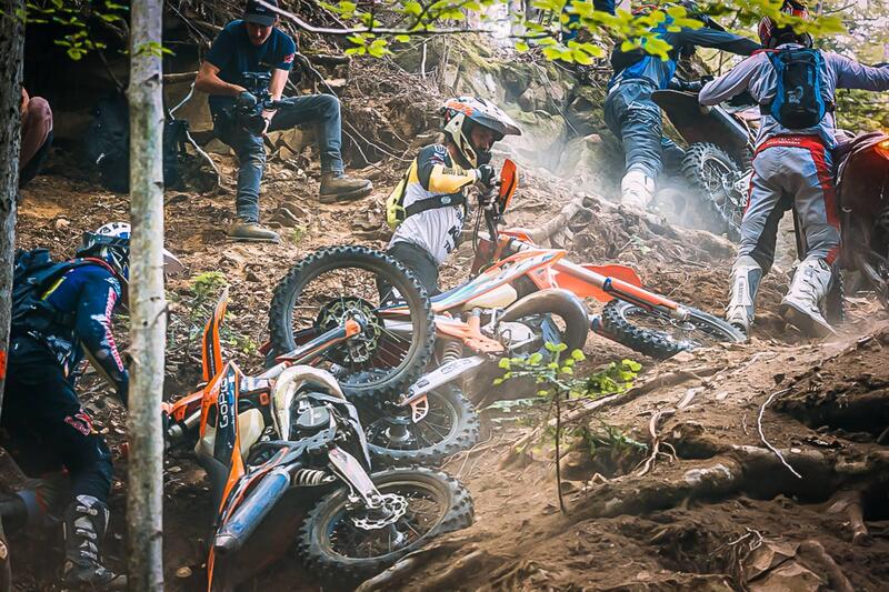 La gara finisce in un turbine di discese …verticali. Spettatori contagiati che rotolano sui sassi, fuoriclasse che volano come overcraft sulle rocce, il borbottio dei due tempi solo per piccole correzioni o guizzi improvvisi. Credete ora, se non avete mai visto, dal vero… non ci crederete! Qualcuno deve arrendersi. Tra questi il quindicenne exploit Nicola Grossi. Ma sono incredibilmente pochi. Orgoglio Hard Enduro. La Gara diventa uno show di reazioni fulminee, talvolta disperate. Energie residue, fondo del serbatoio, fisico in riserva e anima in allarme, e ciononostante il ritmo continua a salire. Ci si aspettava una gara sulle due ore e mezza, ma una “sporca dozzina” è sotto il primato teorico. Un boato sulla spianata dell’arrivo. Bolt, Husqvarna, e Lettenbichler, KTM, spaccano l’orizzonte e tagliano il traguardo. Nell’ordine. Un’ora e tre quarti! Vincitore e vinto separati da 41 secondi! L’ovazione a Jarvis, Husqvarna, ben 13 minuti e mezzo dopo, è un segnale di onore e rispetto. Poi a ruota Walker, Beta, Gomez, Husqvarna, Blazusiak, GasGas. Alla mezz’ora gli ufficiali Sherco Roman e Young, e Micheal fratellino del Dakariano Matthias Walkner. Ai tre quarti d’ora, pensate, una volta e mezzo il tempo dei vincitori, Moret, Rieju, Teasdale, GasGas e Goggia, idem.