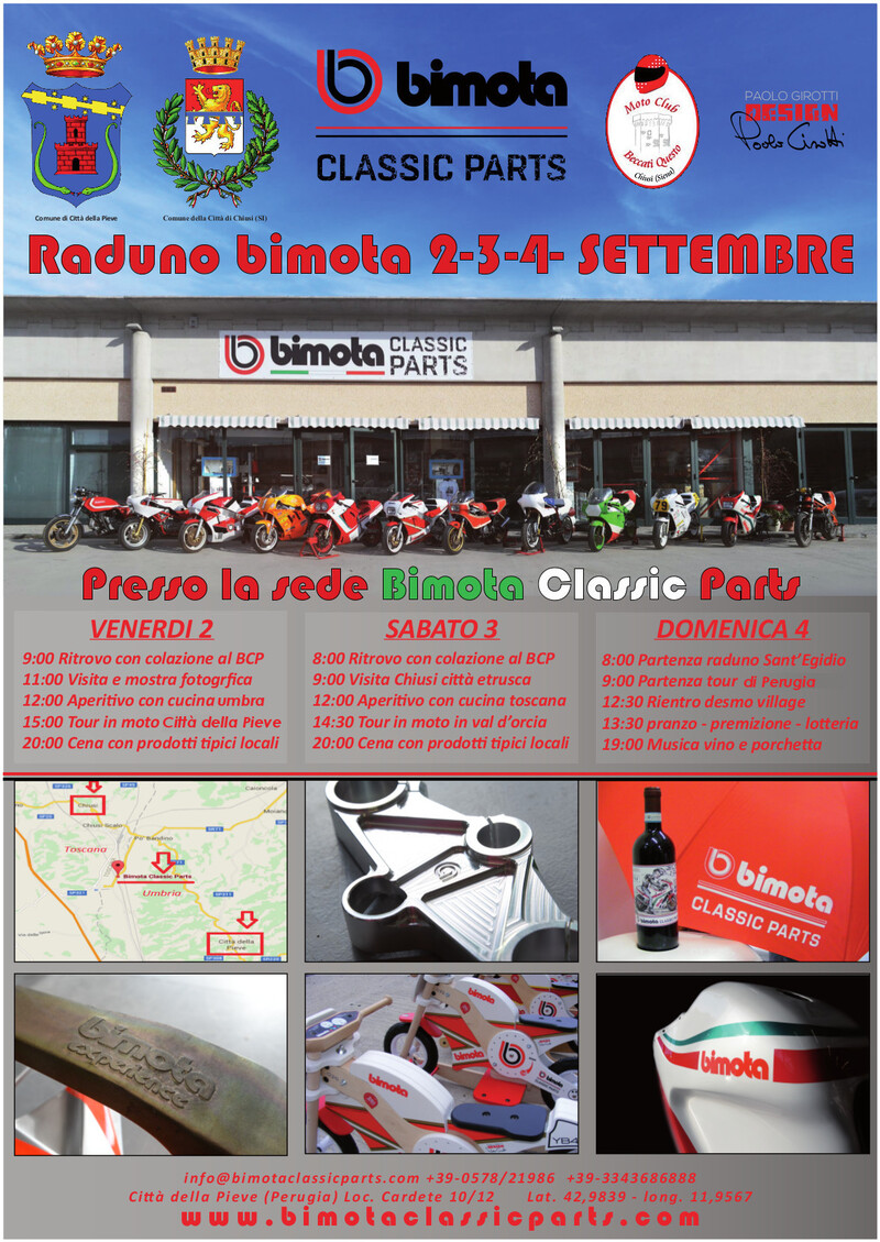 L'evento durerà fino a domenica 4 settembre e avrà in programma, oltre a visite presso la sede Bimota Classic Parts, tour presso i luoghi più tipici della zona, tra i quali la visita a Città della Pieve, Chiusi, con il caratteristico labirinto sotterraneo di Porsenna, la Val d'Orcia e, infine, Sant'Egidio, luogo in cui i partecipanti raggiungeranno il raduno Ducati.