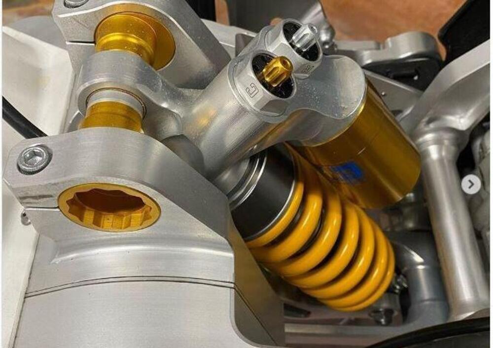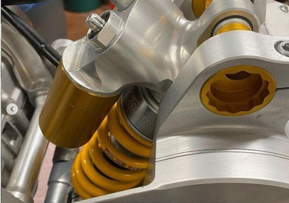 Nuove foto postate sulla pagina IG rivelano poi il forcellone con l'ammortizzatore Ohlins tradizionale montato su attacchi eccentrici. La moto, se tutto andrà secondo i programmi e non ci saranno ritardi con i fornitori, arriverà però già con le sospensioni elettroniche semiattive, sempre Ohlins.