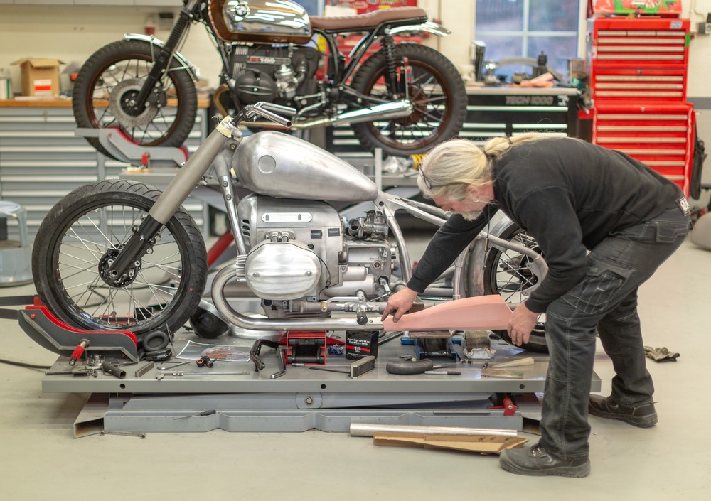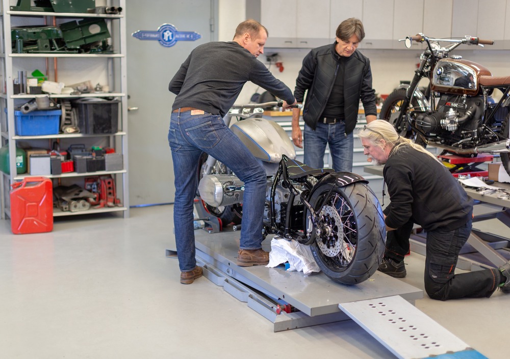 Le filettature di vernice bianca applicate a mano su forcella e serbatoio carburante, in combinazione con il nero, sono il classico tema cromatico caro a BMW. I fari ricordano anch’essi gli Anni 50, ma sono a Led.