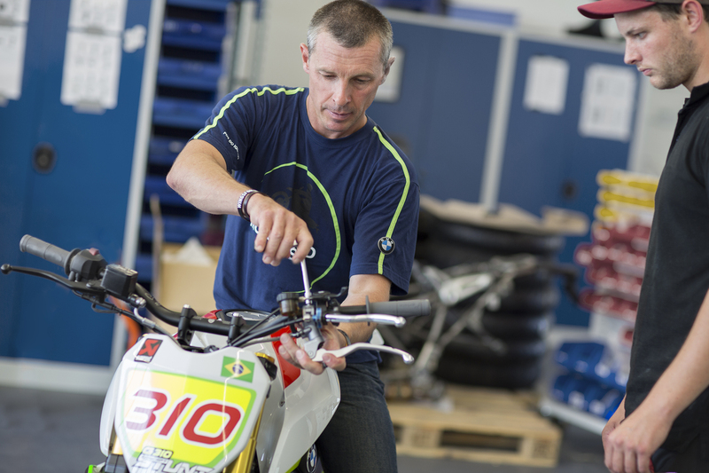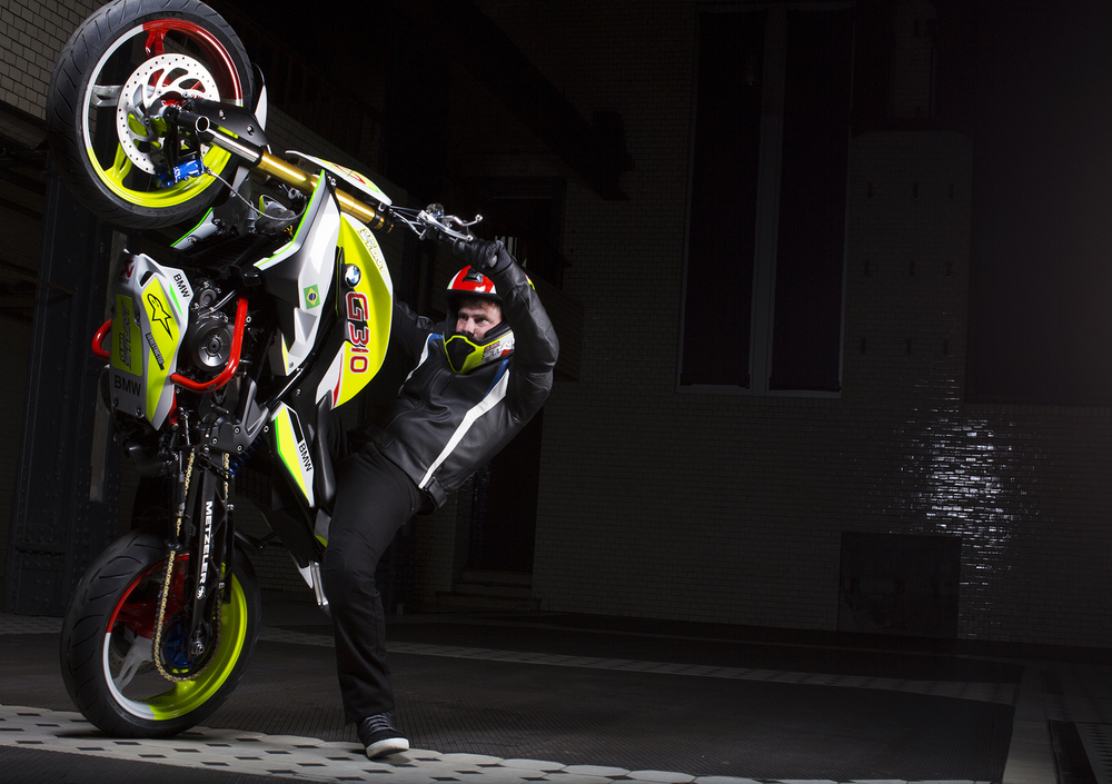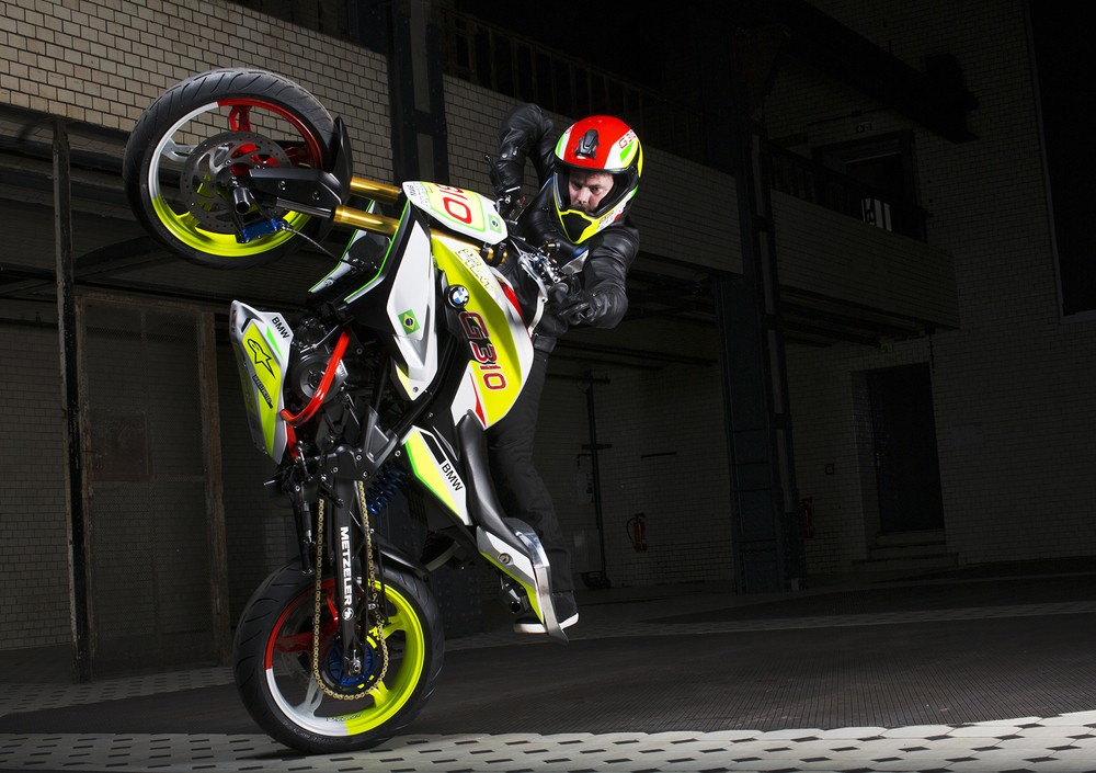 Una caratteristica tipica delle stuntbike sono le numerose soluzioni specifiche, come quelle introdotte da Chris Pfeiffer nella nuova BMW Concept in base alla sua esperienza pluriennale di pilota stunt professionale, e adattate alla moto unitamente al BMW Motorrad Design Team. Tutti gli interventi hanno perseguito lo stesso obiettivo: la massima libertà di azione per il pilota stunt durante i movimenti nello svolgere i suoi trick. L’acceleratore bloccabile assicura una spinta costante, anche quando la mano deve rilasciare la manopola del gas. Inoltre, una leggera modifica del rapporto di demoltiplicazione produce già a regimi bassi una trazione superiore, mentre il freno della ruota posteriore, intenzionalmente sovradimensionato, decelera in modo affidabile in tutte le situazioni. Un secondo freno della ruota posteriore, ancora più grande, permette di frenare la ruota posteriore solo con il dito medio sinistro, nel caso in cui in determinati stunt il piede destro non si trovi sulla pedana per frenare. Grazie alla posizione particolare della leva del freno supplementare sul manubrio sinistro, esso è attivabile contemporaneamente con la frizione. I foot peg sull’asse anteriore e nella zona della sella servono da appoggi supplementari per i piedi, assicurando un supporto sicuro in aggiunta alle normali pedane. Per proteggere il motore sono montate apposite staffe, verniciate in un marcato rosso.