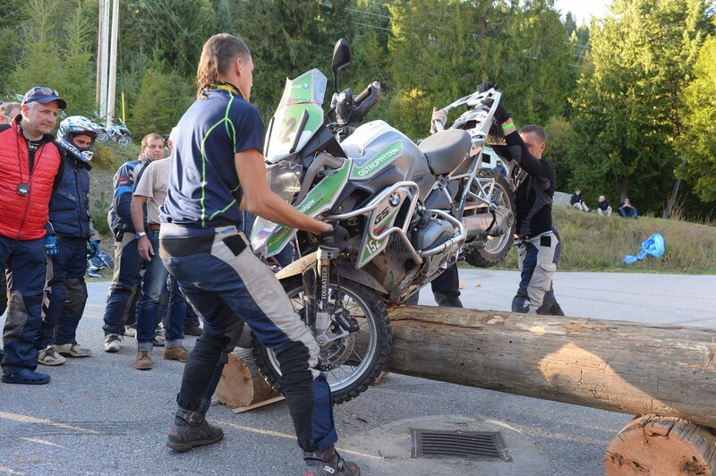 I più veloci hanno potuto godersi un bagno nelle sorgenti termali di Ainsworth sulla via del ritorno al capo base, per dare sollievo ai muscoli doloranti, per poi trovare ad attenderli al Lakeview Lodge l’ultima speciale della giornata: un test di abilità a più fasi comprendente un cambio gomma, test di guida in fuoristrada nonché il sollevamento di una R1200GS sopra un tronco. Il tutto davanti ad una platea di VIP che hanno apprezzato notevolmente lo spettacolo.