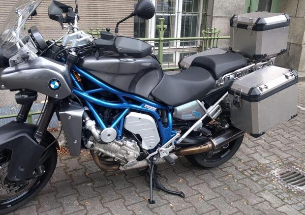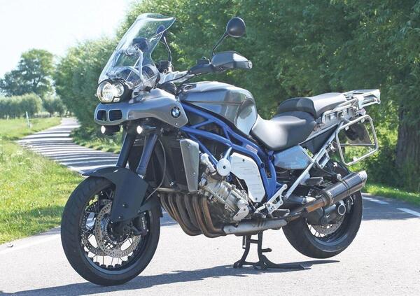 L'impianto di scarico sei in due è uno speciale Akrapovic, selle e posizione di guida sono di scuola GS e così il tris di borse in alluminio.