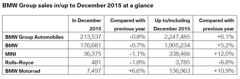 Il bilancio dell'insieme dei marchi BMW, moto, auto, brand Mini e Rolls-Royce, ha visto a sua volta un nuovo record e il quinto aumento annuale consecutivo - soltanto Rolls-Royce ha fatto peggio - con un totale di 2.247.485 veicoli venduti, pari a un +6,1% rispetto al 2014.