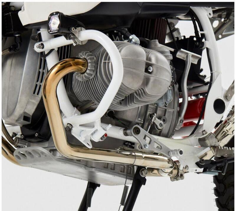 E' della HPN il serbatoio in nylon da 43 litri, replica di quello usato dalle BMW alla Dakar di metà anni Ottanta, mentre portafaro e paramani sono Acerbis. Le borse rigide laterali sono della tedesca Hepco Becker da 30 e 40 litri.