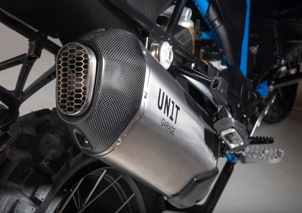 I due paracilindri sono più avvolgenti e sono infulcrati in tre punti sul telaio della moto per proteggere le teste del boxer. Il paramotore in lega leggera Peralluman da 3 mm è stampato a freddo e bugnato con fori di scarico. L’impianto di scarico è un nuovo sistema e comprende il silenziatore omologato, realizzato in titanio e carbonio. Si monta sui collettori originali, lasciando la valvola di scarico e il catalizzatore di serie.