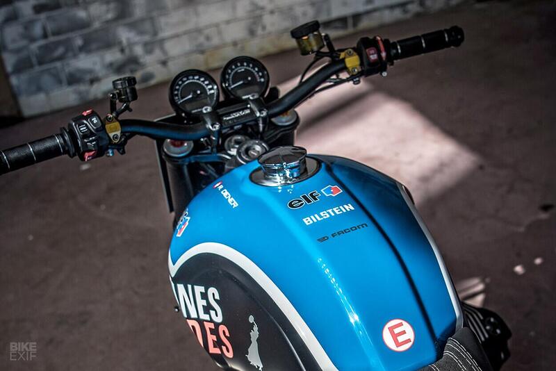 Il serbatoio è quello originale ma modificato per avere il tappo di rifornimento tipo Monza, il nuovo manubrio è un Magura e della stessa marca sono le pompe radiali per i comandi di freno anteriore e frizione.