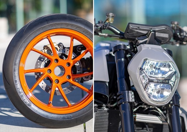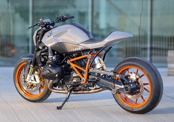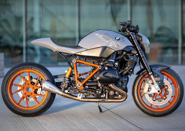 La BMW R1200R utilizzata è un modello del 2015 a cui è stato sostituito il telaietto posteriore, ora più leggero e piccolo, che ospita una sella monoposto. Al posto dell’ammortizzatore posteriore di serie ora trova posto un raffinatissimo Ohlins TTX GP.