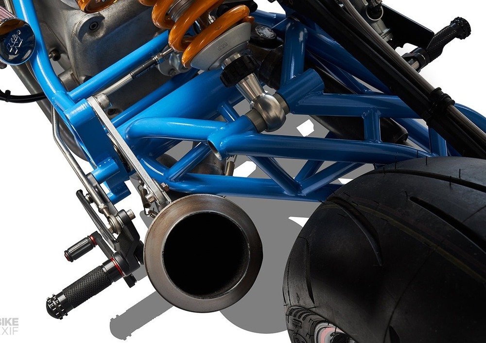 Il telaio, così come il forcellone, è assai scenografico, sia per la forma che per la tinta azzurra, e al posteriore si cela l’albero di trasmissione cardanico della stessa R nineT. L’impianto frenante a marchio Brembo è stato mutuato da un’altra moto della Casa dell’Elica, una S1000R. Perché il posteriore R nineT? Solo per lo sfizio di montare uno pneumatico da 200 mm.