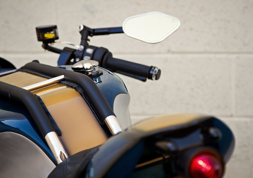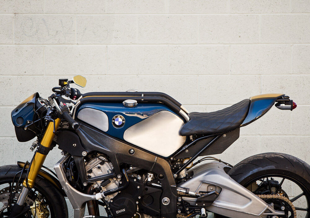 Ma a colpire l’attenzione dell’osservatore sono sicuramente le zone serbatoio e motore. Largo ed ingombrante, quest’ultimo è stato valorizzato invece che nascosto per accentuare la muscolosità della S1000R attraverso l’adozione di un radiatore maggiorato Febur. Il serbatoio è stato risagomato e dotato di due barre che ricordano i passaggi telaio superiori delle boardtrackers volute da Stenegard in persona.