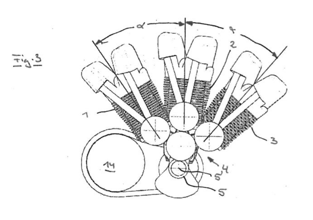 La soluzione vanta per diversi aspetti una certa parentela con il boxer. In primis per l’origine, perché come il bicilindrico contrapposto anche lo schema tricilindrico a W qui proposto ricorda piuttosto da vicino un propulsore stellare di derivazione aeronautica, in questo caso un otto cilindri tagliato “dalla vita in giù”; secondariamente perché nella vista in sezione non è difficile notare come il terzo cilindro venga applicato in maniera quasi posticcia ad un bicilindrico – a V e non boxer, ma con più di una somiglianza. L’imbiellaggio è infatti vincolato a due diversi alberi motore: due cilindri ne condividono uno, mentre il terzo risiede su un albero secondario collegato attraverso ingranaggi.