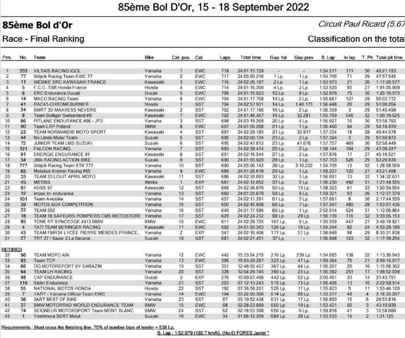 Ma anche la Yamaha del team polacco ha dovuto rientrare ai box a spinta perdendo la testa della gara e quando è ritornata in pista accusava un ritardo di 5' dalla Yamaha privata del team Viltaïs Racing Igol: la squadra francese con i piloti Florian Alt, Erwan Nigon e Steven Odendaal ha così conquistatola sua prima vittoria e lo ha fatto in una corsa prestigiosa.