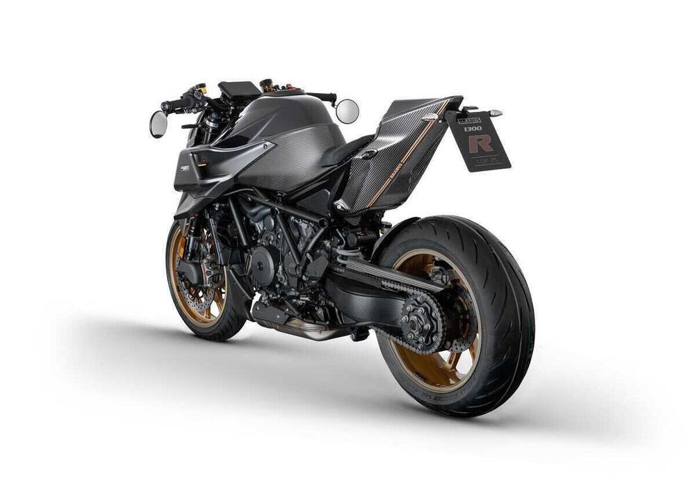 Cosa cambia rispetto al modello 2023? La nuova 1300 R vanta un pacchetto carbonio ancora più esteso, che include le alette di ispirazione racing fissate sui convogliatori laterali, la cover del forcellone monobraccio, i pannelli triangolari sul telaio sotto il serbatoio e la sella, e la cover del coperchio alternatore, ma sono di rilievo anche le ruote forgiate Brabus Monoblock Z con sezioni lucidate, gli anelli decorativi attorno ai due silenziatori e l'immancabile Distintivo di Eccellenza “1 OF 25” sul serbatoio unito alla targhetta Brabus Masterpiece nel supporto lombare dietro al sellino. Il prezzo non è per tutti e ricalca quello della versione 2023: 42.500 euro, per una moto già ordinabile presso i dealer KTM.