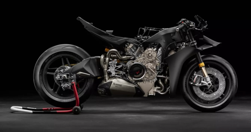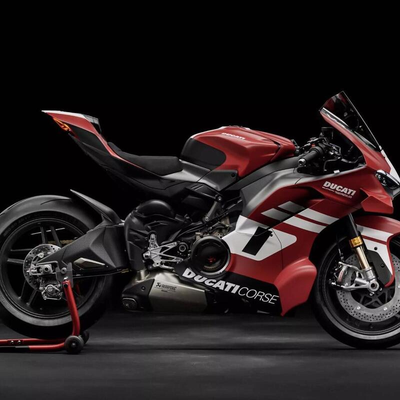Il pacchetto si completa con una novità assoluta: la forcella pressurizzata Öhlins NPX 25/30 Carbon, la prima al mondo con foderi esterni in fibra di carbonio — strati unidirezionali — montata su una moto destinata alla strada. Il risparmio di peso è dell'8% rispetto alla Panigale V4 R e del 10% rispetto alla Panigale V4 standard. La cartuccia pressurizzata riduce la cavitazione e mantiene un comportamento costante in frenata e in ingresso di curva.