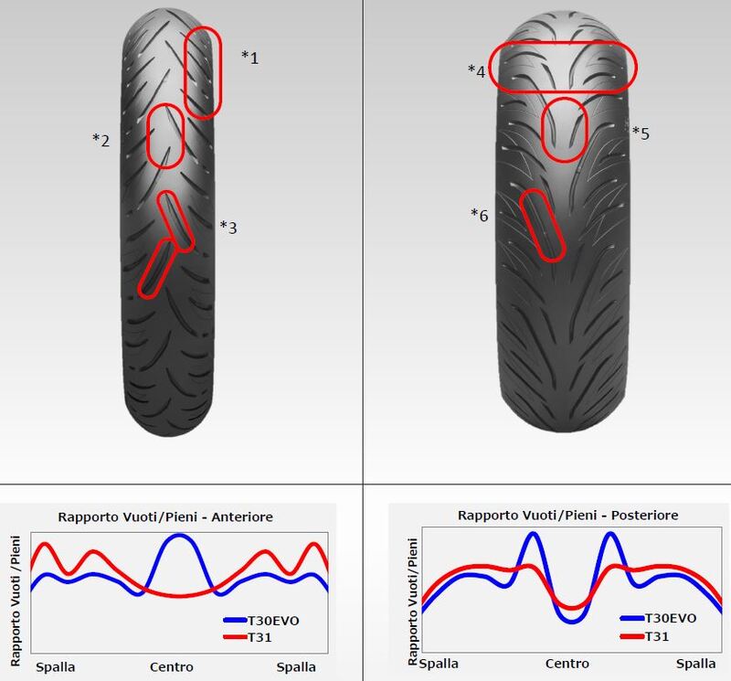 Il disegno battistrada del T31 richiama vagamente quello del precedente T30 Evo – che resta in vendita un prezzo inferiore - e ha intagli più radi ma più profondi nella zona centrale. Il rapporto vuoti/pieni è infatti diminuito nella fascia centrale ed è stato incrementato nella spalla. La diversa angolazione, andamento e profondità degli intagli ha migliorato la spinta laterale ai differenti angoli di piega.