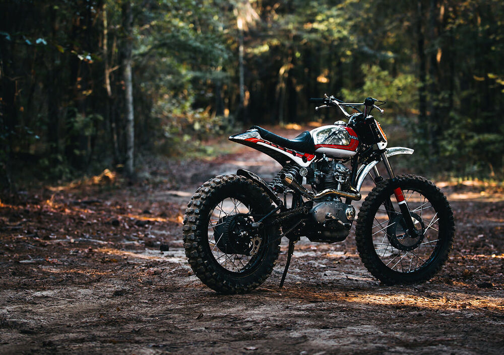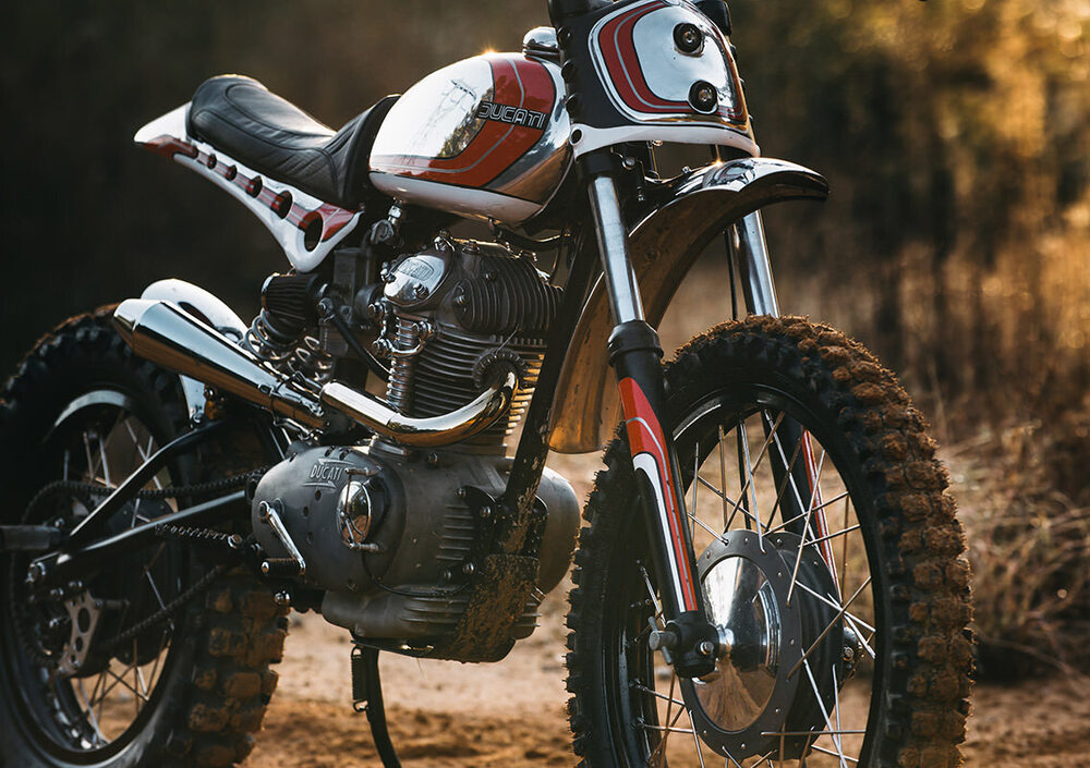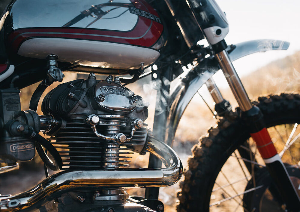 Le modifiche sono iniziate dal telaio, con un nuovo reggisella e relativo codino, ma soprattutto un forcellone allungato di due pollici - circa cinque centimetri - con relativa fabbricazione di tendicatena e guida. Il comparto sospensioni vede all’anteriore una forcella Ceriani dell’epoca, mentre al posteriore i due ammortizzatori Fox sono un tocco moderno che migliora sensibilmente la funzionalità. I cerchi sono Borrani, con mozzi di serie e raggi Buchanan, che calzano gomme Pirelli MT21 RallyCross.