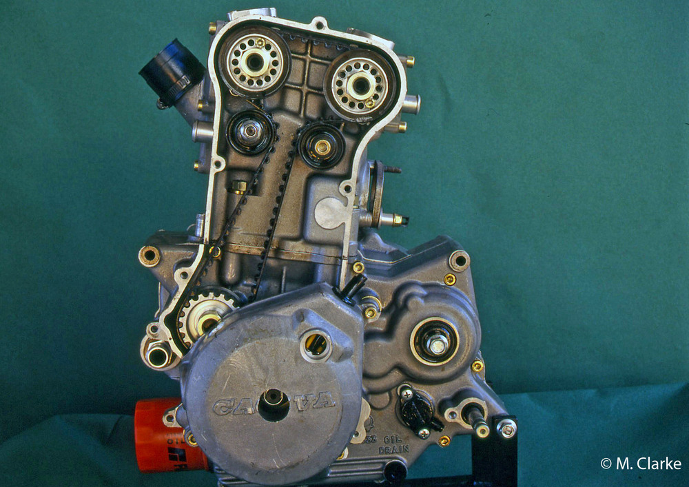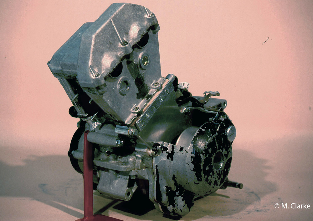 Pure il monocilindrico di 125 cm3 realizzato dalla Gilera nel 1990 era raffreddato ad acqua e aveva la distribuzione bialbero a quattro valvole. L’architettura generale e varie soluzioni tecniche impiegate erano però ben diverse. Spiccavano in particolare il cilindro fortemente inclinato in avanti e il basamento che si apriva secondo un piano orizzontale. A comandare i due alberi a camme provvedeva una catena silenziosa posta sul lato sinistro. I diametri dei funghi delle valvole erano 23 mm alla aspirazione e 20 mm allo scarico. Questo motore aveva un alesaggio di 60 mm e una corsa di 44 mm (il rapporto C/D era quindi 0,733). Per quanto riguarda le prestazioni, si parlava di 18 cavalli a 11.600 giri/min. La potenza specifica era quindi di 144 CV/litro, piuttosto simile a quella delle 600 quadricilindriche sportive dell’epoca (che avevano una cilindrata unitaria di 150 cm3).