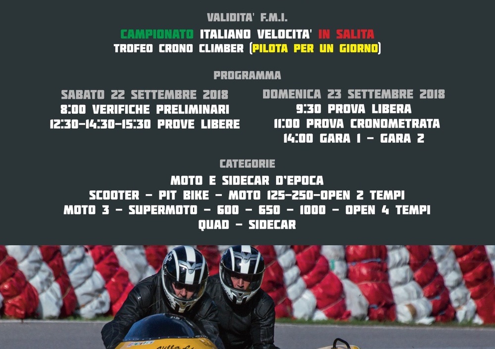 Al via le moto d'epoca, le moderne , i quad e i sidecar. Come sempre, oltre ai piloti d'esperienza, anche i neofiti iscritti con la formula Trofeo Crono Climber, gara in salita ma di regolarità. Nel programma, anche una parata di moto d’epoca aperta a tutti gli interessati, e lo spettacolo offerto dalle Ape Proto, come nel 2017. Come atto conclusivo del fine settimana, proprio a Pieve Santo Stefano si terrà la cerimonia di premiazione del campionato italiano.