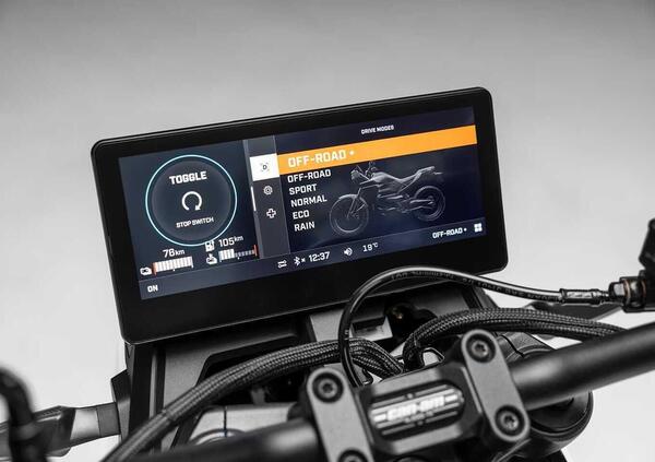 Look più adventure per la Origin che, però, non è da considerarsi una vera e proprio enduro ma un'autentica dual che con comodità e praticità ci può portare un po' ovunque. Le differenze con la Pulse non sono solo ciclistiche ma anche di dotazione. Si notano le ruote a raggi da 21 e 18 con pneumatici Dunlop D605 e una forcella KYB più grande da 43 mm abbinata ad un ammortizzatore sempre KYB HPG completamente regolabile, ciascuno con ben 25 cm di escursione. L'altezza da terra cresce fino a 274 mm, ma aumenta anche l'altezza della sella a 86 cm. Cresce anche il peso di dieci chili (187 kg dichiarati) che assieme alle ruote maggiori e alla posizione del pilota contribuisce di certo ad un risultato meno brillante sul piano dell'autonomia. Vengono dichiarati 115 km nell'uso combinato e 145 km in quello cittadino. Leggermente più lenta anche l'accelerazione che fa segnare comunque un 4,3 secondi per passare da 0 a 100 km/h. Sempre 129 km/h invece per la velocità massima. Rispetto alla Pulse, però, ci sono più modalità di guida, ben sei perché si aggiungono Off Road e Off Road+. Sia ABS sia controllo di trazione sono disinseribili. Come per la Pulse anche per la Origin c'è un modello standard bianco proposto a 17.599 euro con variante "carbon black" a 600 euro in più al quale si aggiunge l'allestimento '73 che per 19.499 euro aggiunge parabrezza, luci a led aggiuntive, telo coprimoto, badge, strisce colorate sulle ruote e verniciatura Sterling Silver.