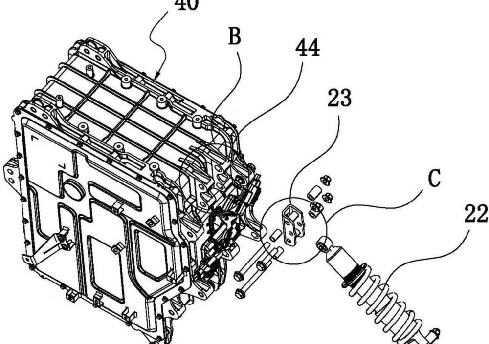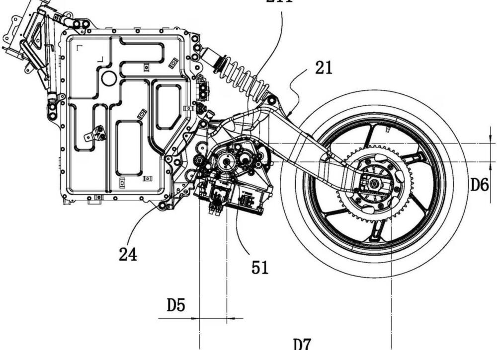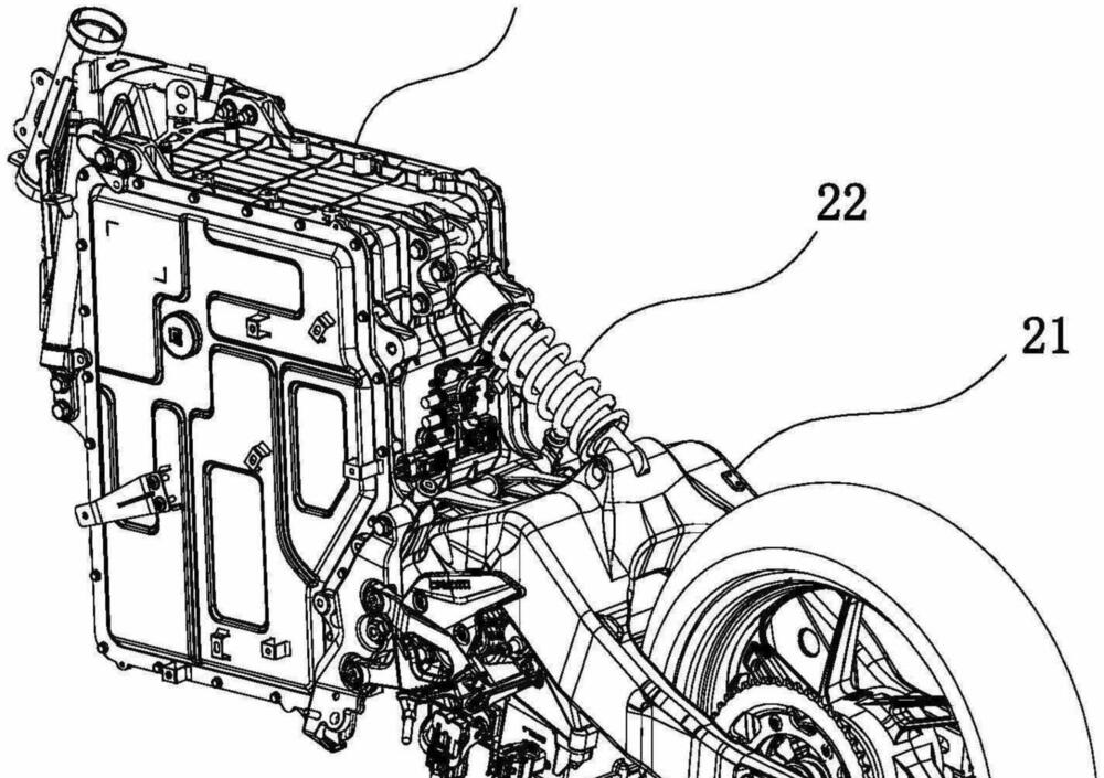 Questa documentazione amplia i disegni diffusi in precedenza, mettendo a fuoco la zona centrale della moto: pacco batterie, propulsore e struttura portante. La batteria lavora come elemento portante del veicolo, mentre motore e trasmissione vengono arretrati per liberare quanto più spazio possibile nel vano centrale, un approccio simile a quello visto su progetti recenti di altri costruttori, come la Honda WN7. Nel layout CFMoto il motore è collocato dietro il perno del forcellone, con un forcellone “a banana” che si incurva verso l’alto passandogli sopra per non aumentare la larghezza complessiva. Questa scelta lascia poco margine per un leveraggio progressivo, l’ammortizzatore posteriore è infatti ancorato direttamente al forcellone, con una staffa che si fissa sul lato posteriore dell’involucro batteria.