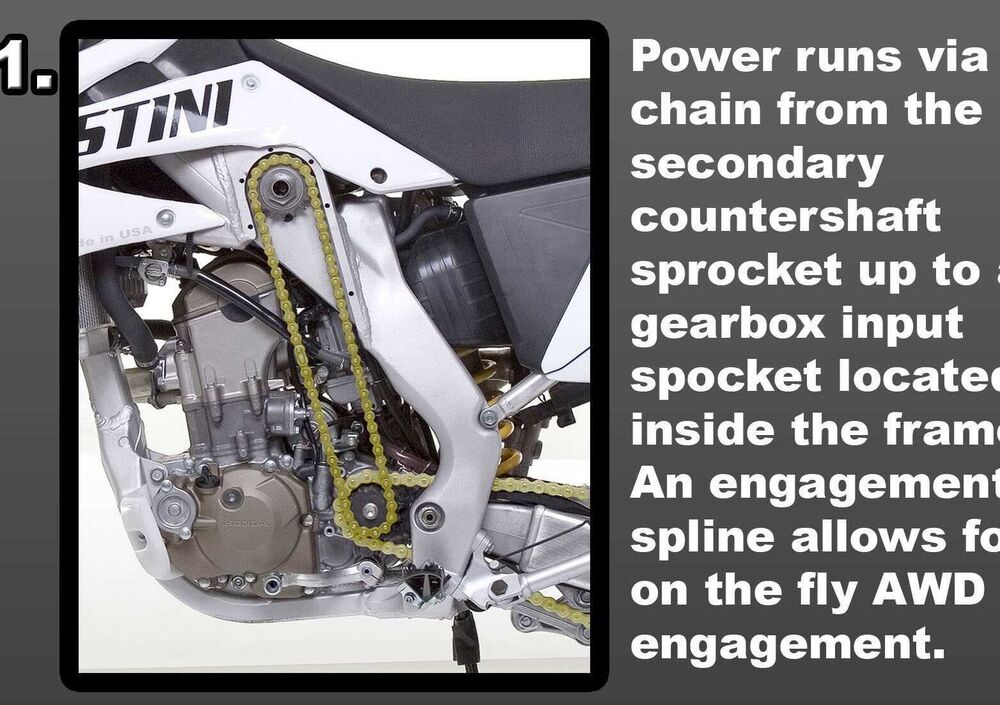 Il kit anteriore viene venduto a 2.000 dollari e consiste in un cingolo con pattino da montare sul perno forcella. Il sistema di trasmissione (nella gallery qui sotto trovate le immagini che lo descrivono) non viene modificato, mentre il fatto di avere la trazione anche all'avantreno migliora tenuta e sterzata sulla neve.
