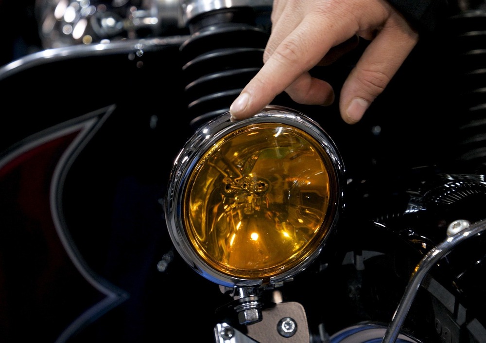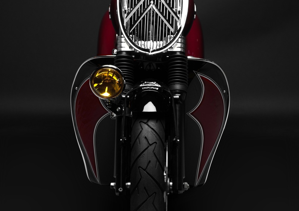 Prendete la scelta di dotare la moto di un solo faro anteriore. Giuseppe Carucci ce l’ha spiegato bene: se inizialmente l’idea di omaggiare la 2CV anche con la presenza di due fanali è stata presa in considerazione, alla resa dei conti si è deciso di optare per qualcosa di più originale, meno scontato, che evitasse di appesantire eccessivamente un anteriore in cui, a farla da protagonista, è la grande griglia frontale. Stessa scelta per il parafango, in un primo momento destinato ad essere carenato lateralmente: meglio mantenere quello di serie, meno ingombrante e bilanciato dalla presenza delle carenature poste davanti alle gambe del pilota.