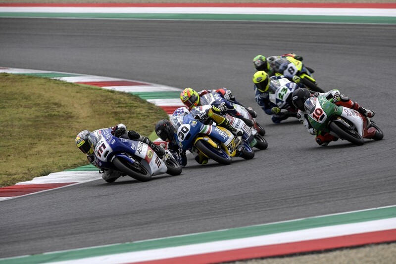 Moto3 che rappresenta sempre una garanzia di spettacolo e di gare combattutissime che lo sono ancora di più al Mugello, dove spesso i piloti arrivano in gruppo e si contendono la vittoria al fotofinish. Sabato Bruno Ieraci, forte anche di una TM davvero veloce, ha smentito quella che sulla pista toscana è la prassi, uscendo di prepotenza dal gruppone in lotta per la prima posizione ed andando a vincere con oltre mezzo secondo su Spinelli, Sintoni e Carraro, che sono arrivati assieme in volata. Domenica la tradizione è stata invece rispettata ed i primi sette piloti al traguardo sono stati divisi da soli due decimi. Ha vinto Spinelli davanti a Ieraci e Zannoni. Con questa vittoria Spinelli si porta in testa alla classifica del campionato con 102 punti e precede Zannoni con 87, Sintoni con 81 e Fusco, che aveva vinto a Misano sotto l’acqua, che di punti ne ha 60. Ieraci si rimette in gioco per il titolo visto che vanta 58 punti così come Carraro, con il quale divide la quinta posizione del campionato.