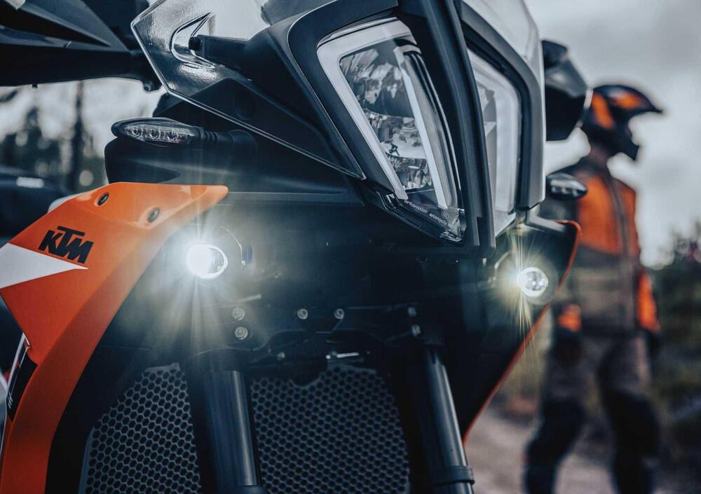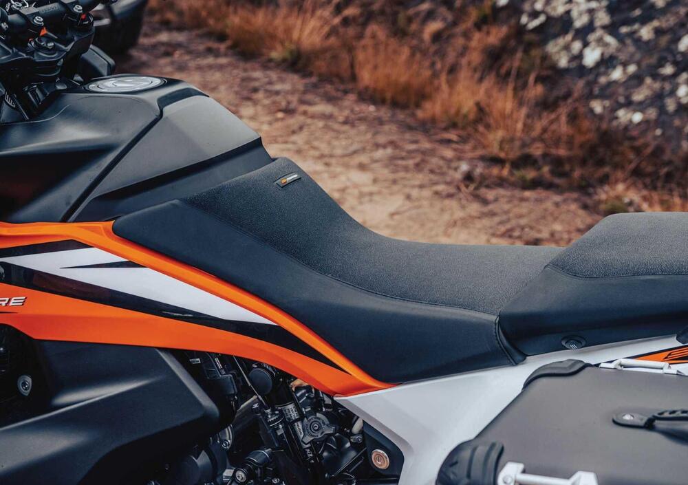 Novità anche per la sella realizzata in due parti, di forma differente nella zona del serbatoio e per la quale viene dichiarato maggiore comfort grazie a una nuova imbottitura. La sella del pilota è come sempre regolabile su due posizioni (840 e 860 mm) ed è possibile ridurre l’altezza a 800 mm grazie alla sella opzionale più sottile e al kit di abbassamento delle sospensioni, entrambi disponibili nel catalogo KTM PowerParts nel quale sono anche presenti selle per il pilota di maggiore o minore altezza, come selle monopezzo in stile Rally (da 825 o 865 mm da terra) o, ancora, selle Ergo riscaldabili nelle misure 850 mm o 830 mm.