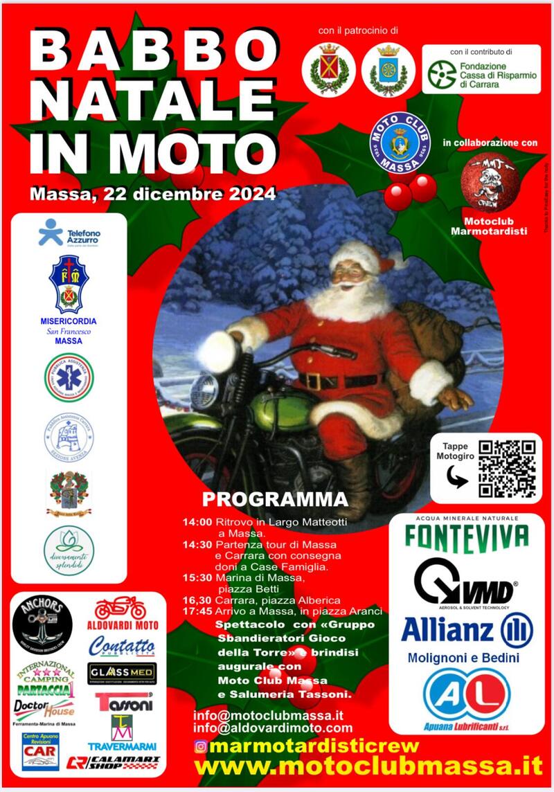 L’appuntamento è fissato per Domenica 22 dicembre alle ore 14:15 presso Largo Matteotti a Massa. La partenza è prevista per le ore 14:30 e ci si muoverà scortati dalle pattuglie motociclistiche della Polizia Locale di Massa per un tour tutti insieme, tutti vestiti con l’abito di Babbo Natale, tutti in moto.