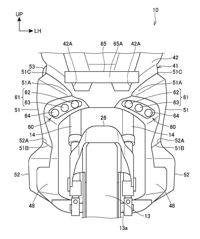 Di certo Honda è al lavoro come sempre sui mezzi del futuro, tra i quali ci sarà la terza generazione di X-ADV. Gli schemi di nuovi brevetti richiesti in Giappone dalla Casa e divulgati in rete dai colleghi di Cycle World ci anticipano oggi come potrebbe apparire. Il nuovo brevetto richiesto da Honda riguarda infatti dei gruppi ottici e ci mostra un veicolo molto simile all'attuale X-ADV, quantomeno riconoscibile come tale, anche se con alcune differenze importanti. Le modifiche si concentrano in particolare su anteriore e posteriore e ci mostrano come le luci siano spostate verso il basso dalla loro posizione convenzionale andando ad occupare la parte inferiore dello scudo. Ci sono tre elementi a LED separati in ciascuno dei due gruppi ottici e una striscia sempre a LED più in alto sul muso per la luce diurna DLR. Ognuna delle tre lampade ha ovviamente il proprio scopo con la coppia interna a fare da anabbaglianti mentre quella centrale è la luce abbagliante. Quelle più esterne infine sono delle luci di svolta e - secondo la tendenza che vedremo sempre più presente sulle moto dei prossimi anni - si illuminano con l'inclinazione della moto in modo da illuminare meglio l'interno della curva.