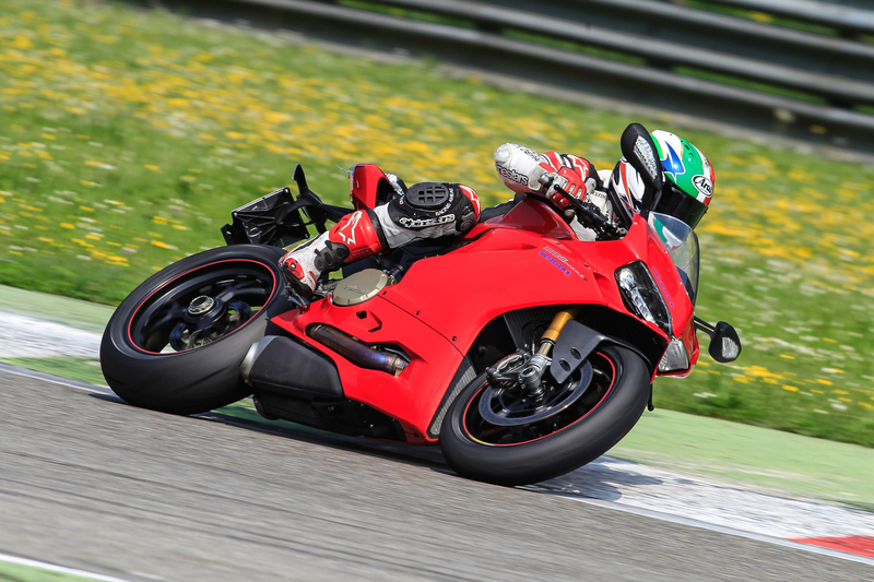 «L’inserimento in curva è veramente impressionante, fulmineo, tanto che potrebbe mettere in difficoltà chi non è abituato ad usare moto da corsa. Un comportamento che deriva indubbiamente dallo schema del motore: il V4 ha un albero motore molto più stretto, quasi la metà degli altri quattro cilindri, che facilita e velocizza l’ingresso in curva. Il feeling è ottimo – tra l’altro credo sia l’unica moto del lotto con un leveraggio posteriore non progressivo, che in pista fa lavorare meglio il posteriore. C’è una maggior progressione dell’ammortizzatore, senza che si inneschino quegli ondeggiamenti che si verificano sulle altre quando si alza il ritmo ed il mono inizia a lavorare nella fase progressiva del leveraggio».