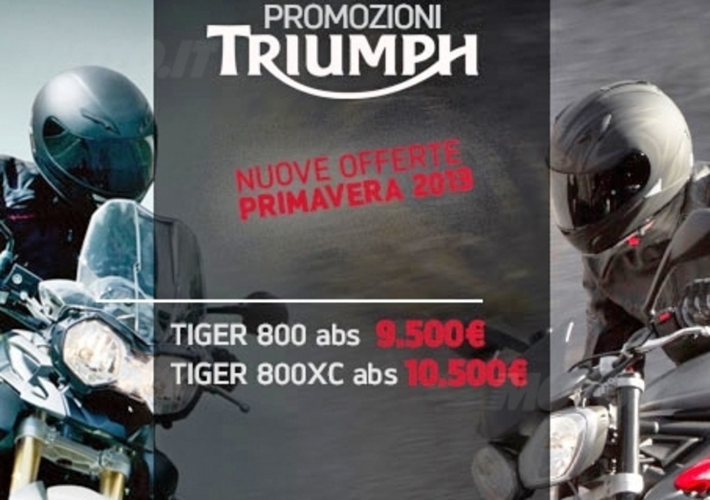 Tiger 800/Tiger 800 XC con ABS: fino al 30 giugno la versione con ABS dell’Adventure Tourer di media cilindrata di Triumph sarà in promozione al prezzo speciale di 9.500€ e 10.500€. L’offerta è cumulabile con la promozione sugli accessori di Triumph Extra.