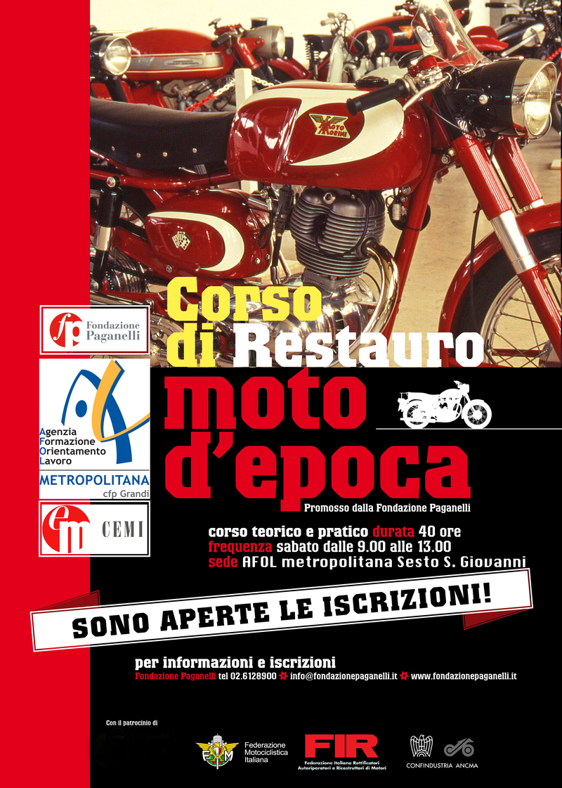 Sono dedicati agli appassionati del settore i corsi di restauro delle moto d’epoca promossi dalla Fondazione Paganelli, in collaborazione con l’Afol metropolitana Cfp Grandi e l’associazione culturale Cemi. Consentono ai partecipanti non solo di conoscere la tecnica di tanti affascinanti modelli, ma anche di “mettere le mani” sui motori.