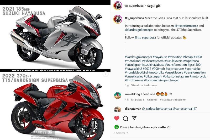 Un lavoro notevole che ha portato Richard Albans di TTS Performance a chiedergli di inventare un design per una Hayabusa di terza generazione dotata del kit TTS che il produttore di Silverstone vuole costruire come piccola serie di special per celebrare il proprio quarantennale. Nasce così la SuperBusa da 370 cavalli grazie al kit TTS e dalle linee e livree opera di Kardesign, potete ammirarla - e bramarla - sulla pagina instagram del progetto SuperBusa: si avvale di una dotazione tecnica che prevede oltre alla profonda trasformazione del motore dotato del compressore Rotrex C30-94, i cerchi Rotobox in fibra di carbonio, un forcellone monobraccio, dischi freno più grandi, sospensioni migliorate, un generale upgrade del motore per renderlo adatto al notevole potenziamento, un intercooler e... le winglets che certamente saranno molto utili a far tenere il muso a terra alla SuperBusa dopo un'iniezione di 180 cavalli ai 190 originari.