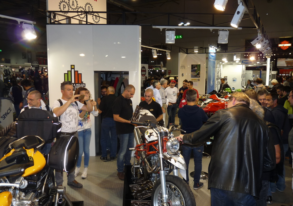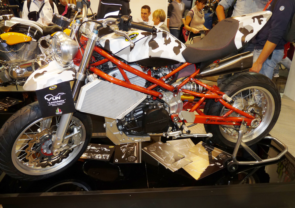 Ormai siamo abituati all’estro imprenditoriale che contraddistingue le creazioni della CR&S, che anche quest’anno condividevano lo stand di Officina Moto Italia con le novità Magni e Pattoni. È arcinoto che il marchio milanese produca le esclusive monocilindriche Vùn (“Uno”, in dialetto meneghino), con motore BMW 650, e le bicilindriche Duu (“Due”) motorizzate col V2 S&S da 1.916 cc. Di entrambi i modelli, dall’atelier di Settimo Milanese questa volta sono arrivate due novità: la prima è la Vùn denominata simpaticamente “Lamichetta” (volutamente senza apostrofo né spazi), una sorta di allegra supermotard con grafiche camouflage bizzarramente denominate “secapisnagot”, definizione non certo vichinga, bensì attinta rigorosamente dal dialetto nativo, e che tradotta letteralmente sta per “nonsicapisceniente”.