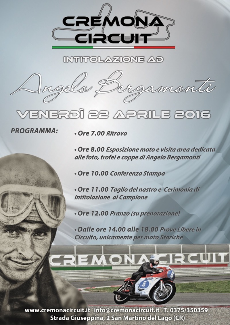 Il giorno 22 aprile 2016 si terrà la cerimonia per intitolare il circuito di Cremona ad Angelo Bergamonti. La mattina le autorità locali e le rappresentanze sportive effettueranno il taglio del nastro. Successivamente si terrà la visita alla mostra in memoria del grande campione cremonese, e nel pomeriggio avrà luogo la sessione di prove libere esclusivamente dedicate a moto d'epoca e sidecar. Contemporaneamente, nel Kartodromo, sessioni di prove per kart storici.