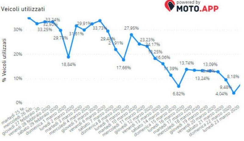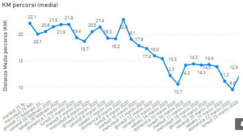 Se nel periodo fra il 24 febbraio e l'11 marzo, primo giorno di applicazione del provvedimento “Io resto a casa”, si era registrato un dimezzamento dell'uso (-47%, passando dal 34 al 18% dei veicoli circolanti) e una diminuzione del chilometraggio giornaliero del 29%: Nel periodo successivo questi numeri sono scesi ancora.