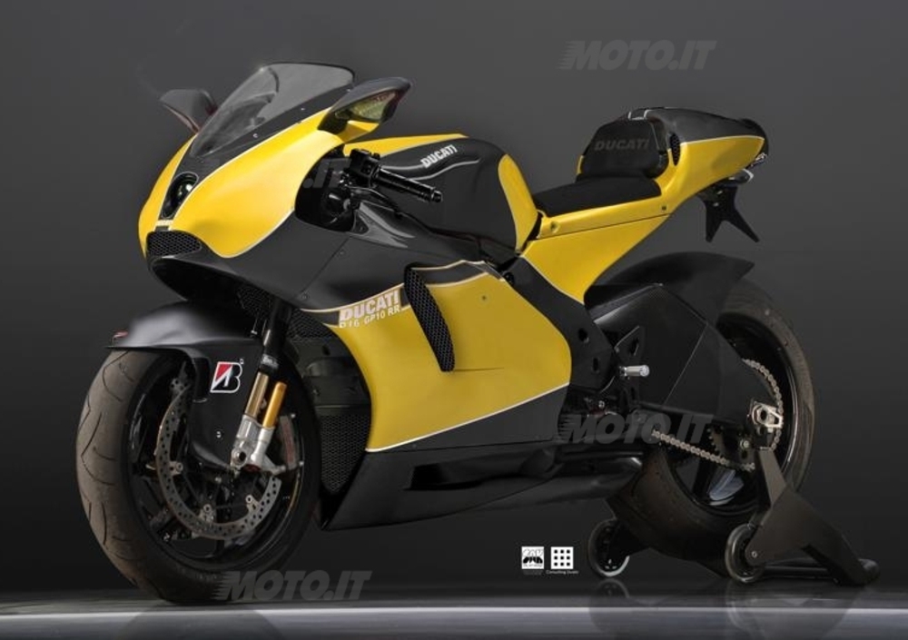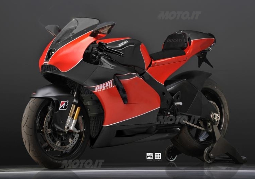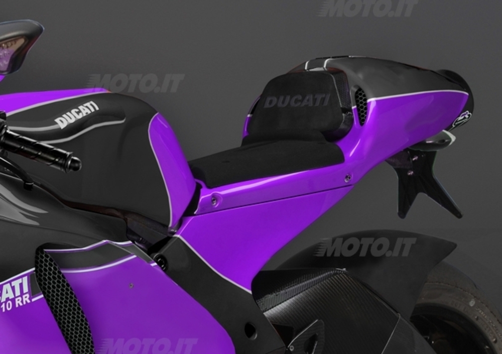 La prima area si apre frontalmente sul capolino e ingloba il gruppo ottico; la seconda nasce dalla presa d’aria frontale e avvolge la zona superiore della carena e parte del serbatoio per proseguire fino alla zona delle pedaline. Il black si interrompe sotto il nastro (anch’esso nero), che contiene il logo Ducati e la sigla D16 GP10 RR, qui domina il rosso con la grande presa d’aria laterale. La zona inferiore della carena nera ingloba nelle sue forme la stampella laterale sul lato sinistro e lo scarico sul lato destro. Il codino è suddiviso dalla bicromia e ospita il grande scarico posteriore Termignoni, opportunamente strozzato per poter circolare su strada.