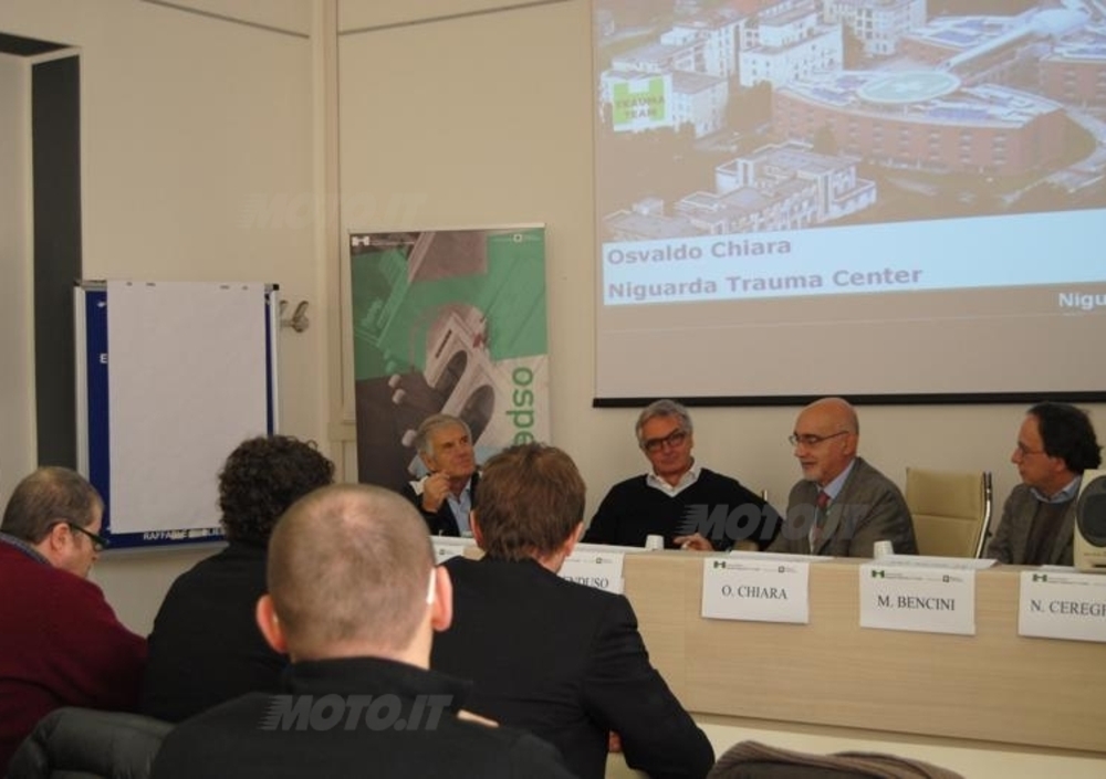 Per divulgare questo importantissimo e interessante lavoro di ricerca congiunta, è stata organizzata una conferenza stampa proprio al Niguarda, preceduta da un istruttivo meeting multimediale a beneficio di oltre 300 studenti del Liceo Scientifico Bertrand Russell, con il nostro Nico Cereghini in veste di presentatore. In cattedra, assieme al Direttore Sanitario, professor Giuseppe Genduso e al dottor Chiara, sedevano gli esperti della Dainese - Vittorio Cafaggi e Marcello Bencini (design manager safety equipment del D-Tec vicentino) - e il giovanissimo Francesco Bagnaia, che assieme a Romano Fenati correrà il mondiale Moto3 con il neonato team VR46 di Valentino Rossi.