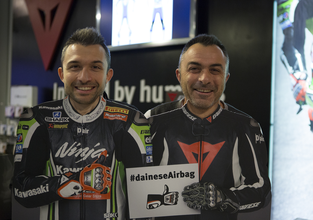 Il richiamo dell’evento fuorisalone è sempre più forte un po’ per tutti: non fa eccezione Dainese, che ha colto l’occasione della rassegna meneghina per ospitare addetti ai lavori ed amici presso il suo store di Via Tertulliano. Diverse le occasioni da festeggiare, dal milione di likes su Facebook collezionati dall’azienda vicentina fino alla vittoria nella Superbike EVO di David Salom con Kawasaki passando per il titolo italiano Superbike conquistato da Ivan Goi sulla Ducati del team Barni. E, perché no, conoscere Geoff May, pilota ufficiale della EBR-Hero, ma anche scherzare per stemperare l’amarezza di Tom Sykes.