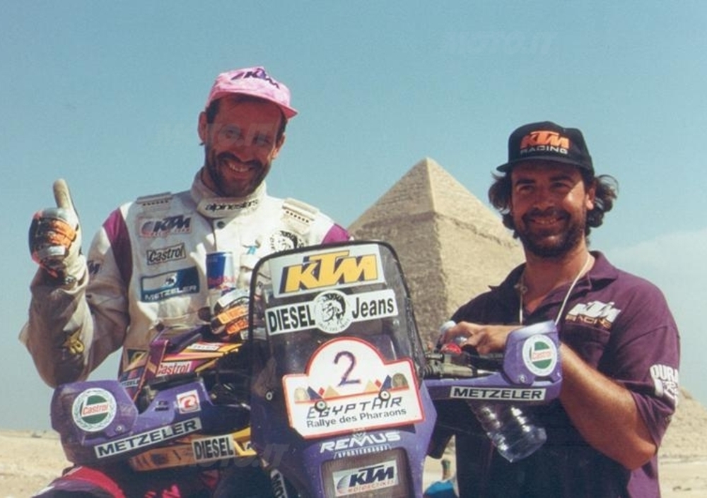Quando Heinz Kinigadner e Chris Attiger decisero di “fare” la Dakar, il geniale ed estroverso Campione austriaco e l’eclettico Pilota svizzero avevano solo una grande e formidabile idea in comune, che debordava ormai incontenibile, ma un impianto tecnico pressoché inesistente poiché KTM, già regina dell’Enduro e del Motocross (proprio con “Kini”), non si era mai cimentata, se non episodicamente e a titolo personale dei personaggi implicati, nel difficile “esercizio” africano. Fu grazie alla travolgente passione di Kinigadner, “trasfusa” nel genio di un ex Pilota e poi meccanico spagnolo di Castellon, Fernando Prades, che tutto ebbe inizio. Sulle guidelines di quella passione iniziò la storia. Sì, proprio quella che oggi si può leggere tra le righe delle 12 vittorie consecutive ottenute alla Dakar dalla Marca austriaca. A partire dall’indimenticabile successo di Fabrizio Meoni nel 2001, raddoppiato l’anno successivo non più con la Monocilindrica Rally, frutto dell’immaginazione di “Kini” e di “Pikolo” (è il soprannome di Prades) bensì con la rivoluzionaria bicilindrica LC8. Heinz non vinse mai la Dakar, non ostante il Campione austriaco abbia sempre fatto “sentire” alla maratona africana la sua straripante personalità umana e sportiva, ma ottenne, tra gli anni 1992 e 2000, altri importanti successi al Faraoni, alla Parigi-Mosca-Pechino e al Rally di Dubai, vinto tre volte.